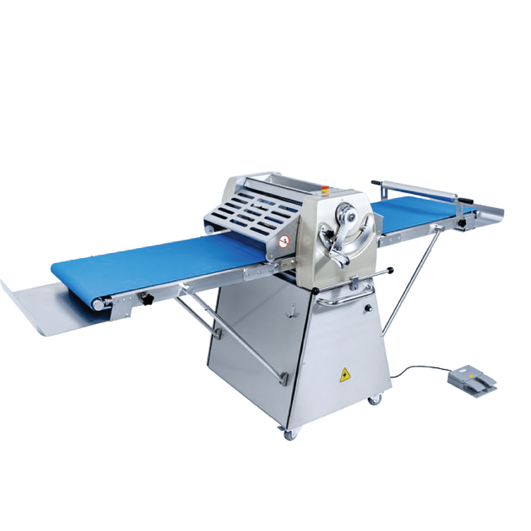 Mesin Dough Sheeter (Mesin Penggiling Adonan) 520mm adalah peralatan bakery semi-otomatis yang dirancang untuk menipiskan adonan secara merata dan konsisten dengan lebar maksimum lembaran adonan sekitar 520mm (mengacu pada lebar roller).