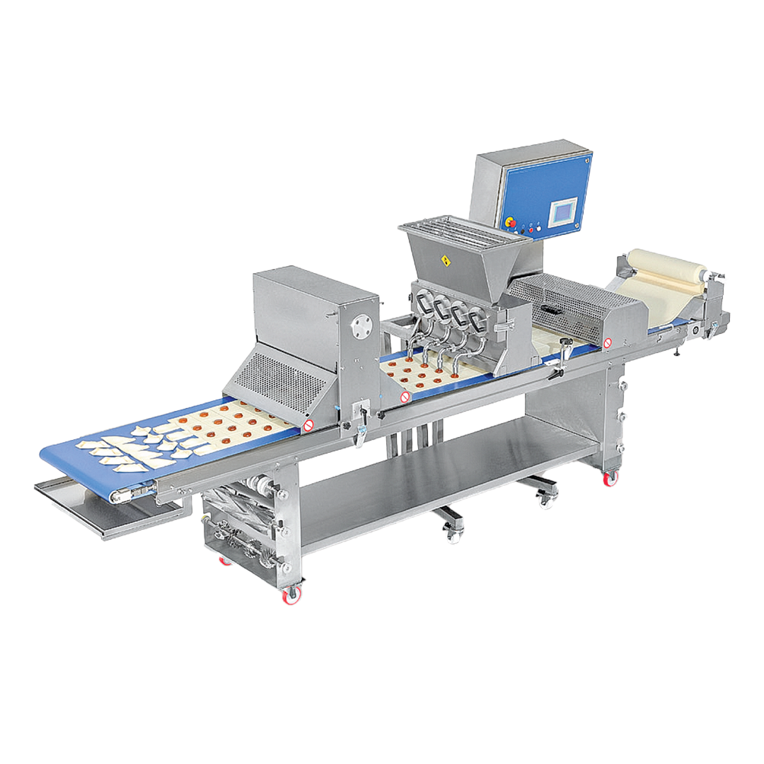 Mesin ini dirancang sebagai lini produksi “all-in-one” yang mengotomatisasi proses pembentukan, pengisian, dan pemotongan adonan (dough) untuk skala industri. Alat ini mengubah proses manual yang memakan waktu menjadi alur kerja yang efisien dan higienis.