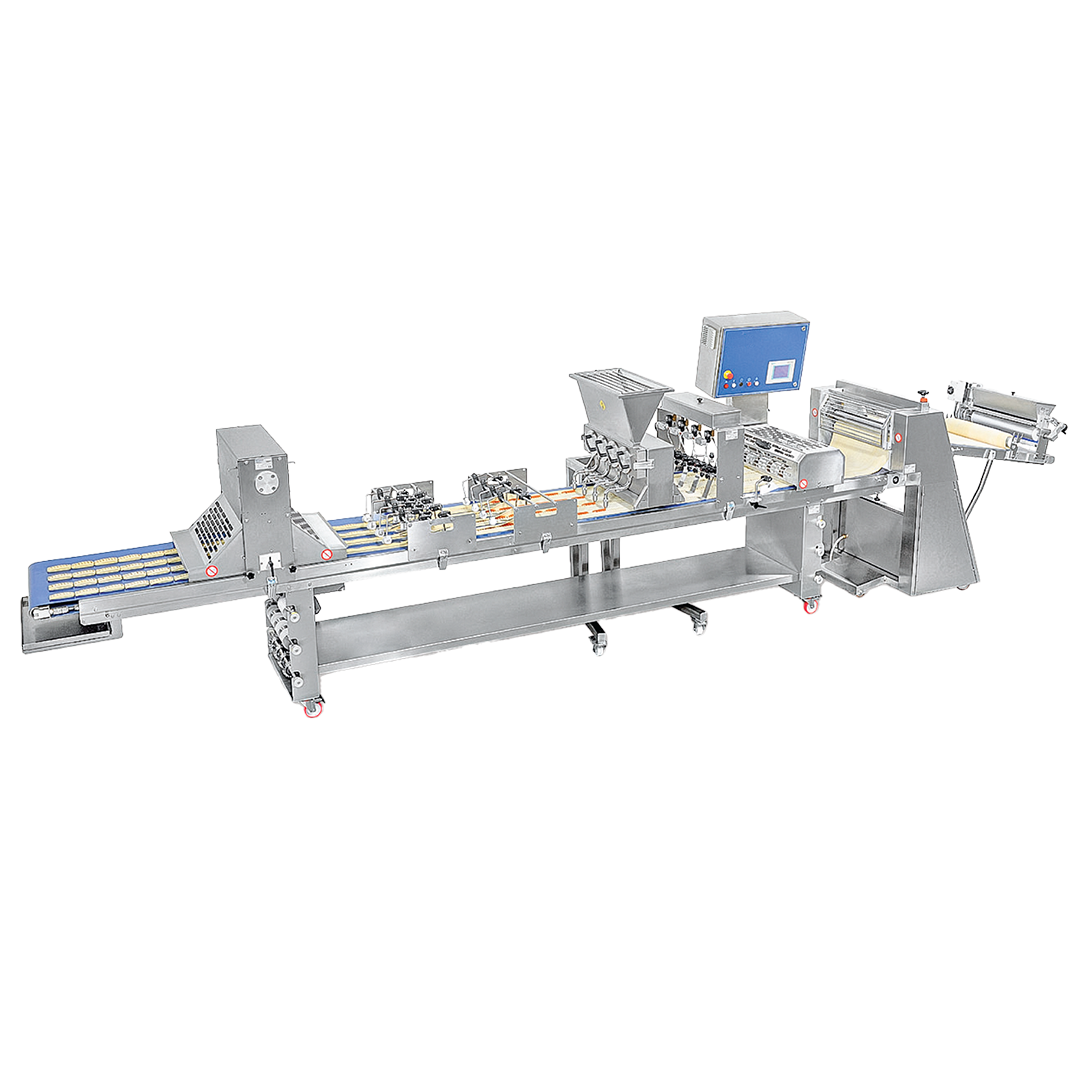 Mesin ini dirancang sebagai lini produksi “all-in-one” yang mengotomatisasi proses pembentukan, pengisian, dan pemotongan adonan (dough) untuk skala industri. Alat ini mengubah proses manual yang memakan waktu menjadi alur kerja yang efisien dan higienis.