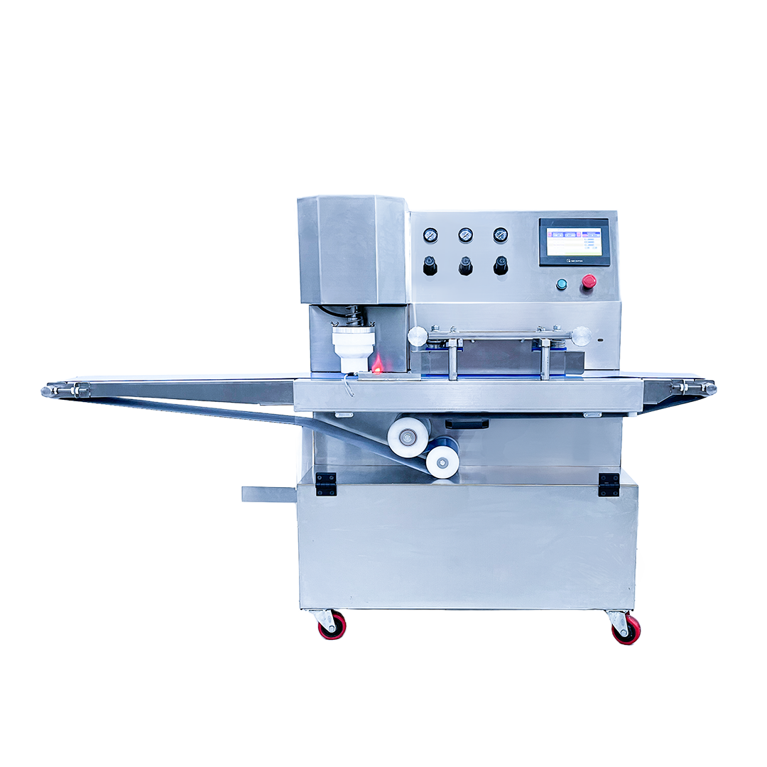 • Sistem Konveyor: Adonan masuk melalui konveyor dan diposisikan di bawah kepala stamping yang akan menekan atau mencetak bentuknya. Produk yang sudah dicetak kemudian diangkut keluar untuk proses selanjutnya (misalnya, panning atau pemanggangan).