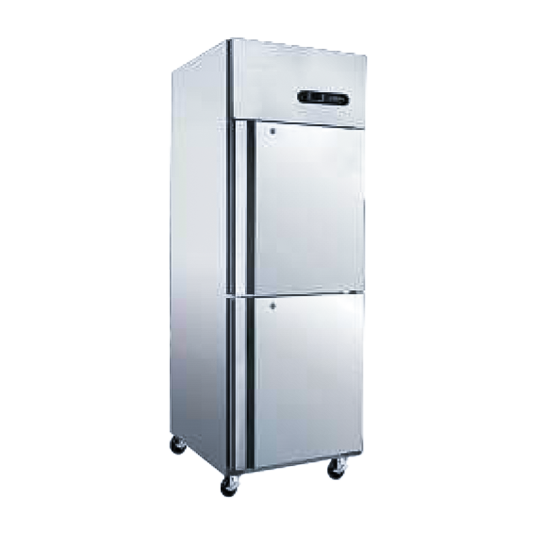 Upright Freezer adalah lemari pembeku komersial yang berdiri tegak (upright), dirancang khusus untuk pembekuan dan penyimpanan bahan makanan beku dalam skala industri kecil hingga menengah. Meskipun memiliki dua pintu (atas dan bawah), model ini beroperasi sebagai satu unit Freezer penuh.